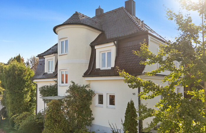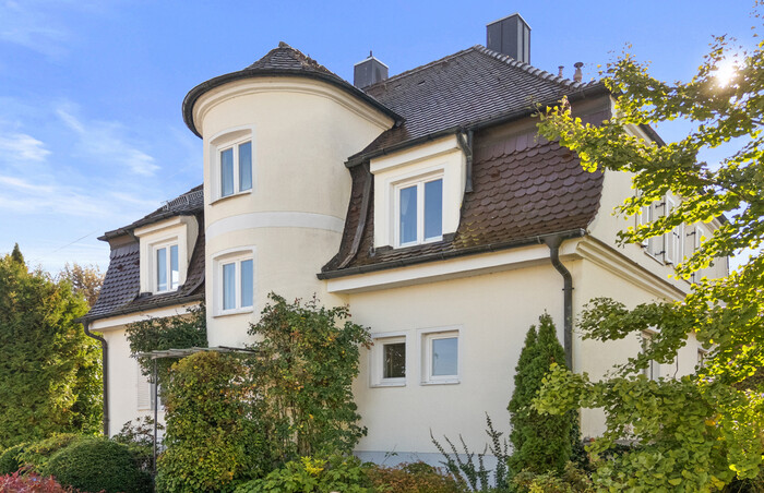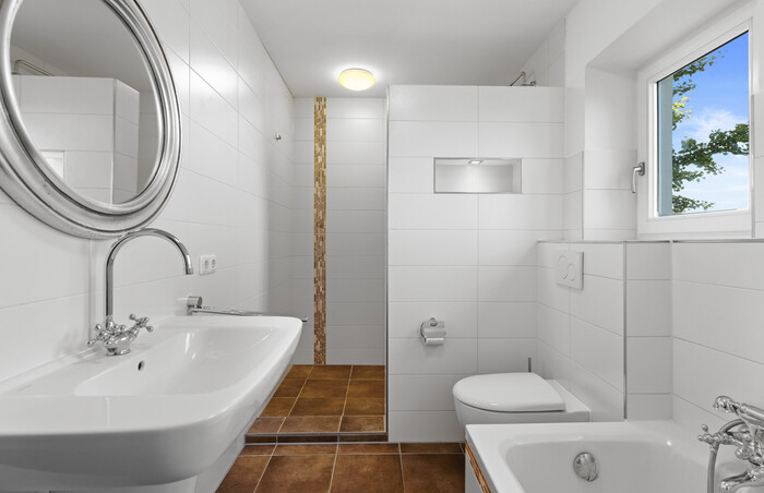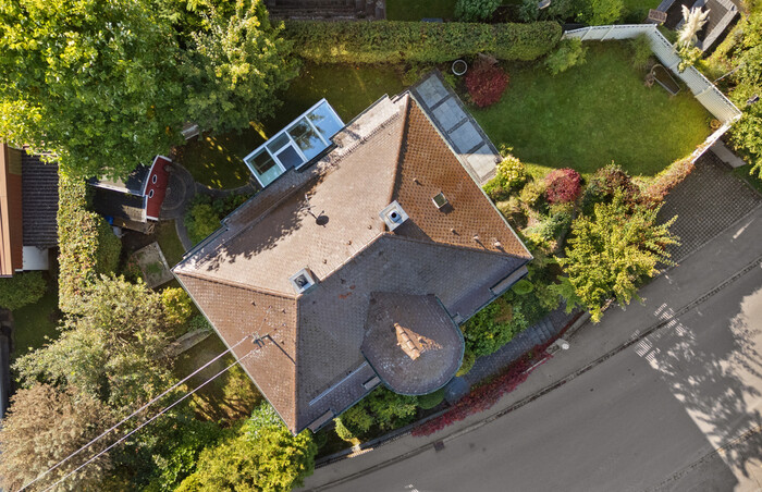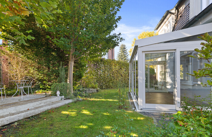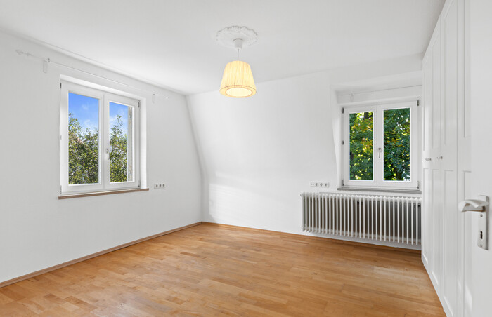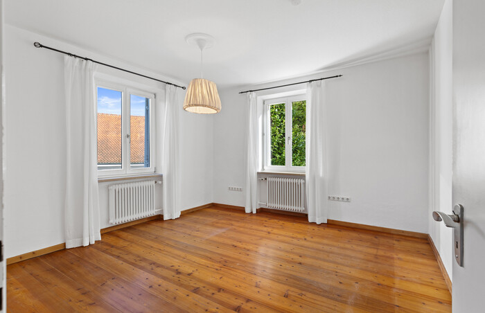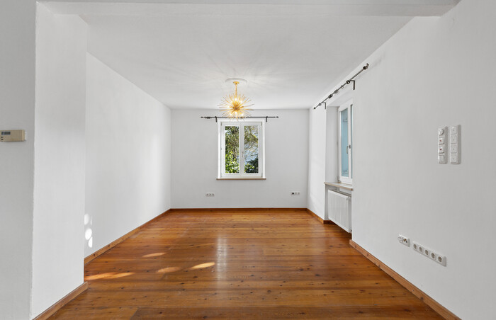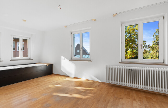 In der Liegenschaft warten fünf Schlafzimmer auf individuelle Nutzung: Rückzugsorte für die Familie, Gästezimmer, Büro oder Ankleide – alles ist möglich. Die Parkettböden im Erd- und Obergeschoss setzen warme, zeitlose Akzente und tragen die hochwertige Anmutung des Hauses.