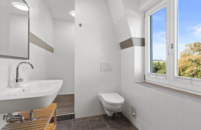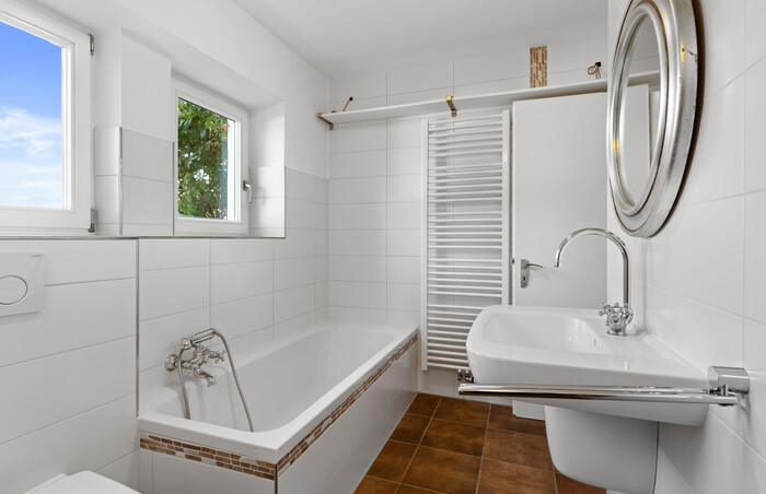Die Einbauküche präsentiert sich stilvoll und modern – durchdacht geplant, mit klaren Linien und genügend Stauraum. Zwei gepflegte Bäder sorgen für komfortable Morgenroutinen.