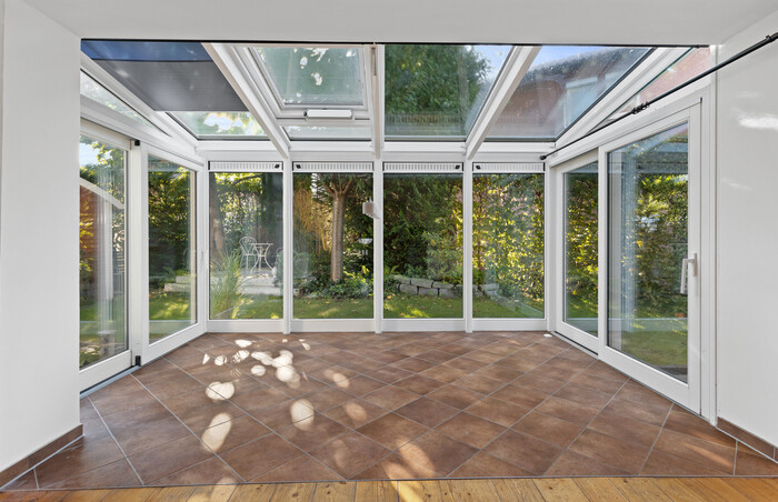 Der offene Grundriss im Erdgeschoss lässt Kochen, Essen und Wohnen fließend ineinander übergehen – ideal für das gemeinsame Alltagsleben und gesellige Abende. Ein Highlight ist der Kaminofen, der an kühleren Tagen eine behagliche Atmosphäre schafft. Von hier öffnet sich der Blick in den hellen Wintergarten, der wie ein zweites Wohnzimmer wirkt: Frühstück im Morgenlicht, Lesen am Nachmittag, laue Sommerabende mit Freunden – dieser Raum verlängert die Jahreszeiten.