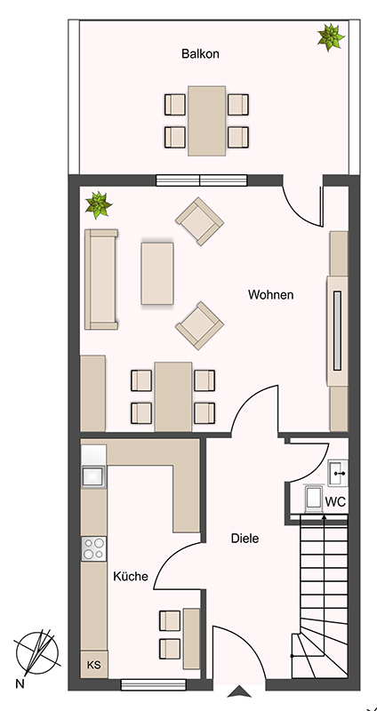 Bereits beim Betreten fällt der durchdachte Grundriss auf: Über die Diele öffnet sich die Küche sowie der Wohn- und Essbereich mit Zugang zum großen Balkon – ein sonniger Freiraum für Frühstück, Feierabend und Freunde.