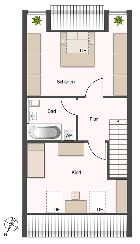 Über die interne Treppe erreicht man die obere Ebene der Maisonette: ein luftiger Bereich mit Galerie-Charakter, perfekt als Schlaf- und Kinderzimmer oder für einen Homeoffice-Arbeitsplatz. Das zeitlos gestaltete Bad rundet den Wohlfühleindruck ab – kompakt, funktional, gepflegt.